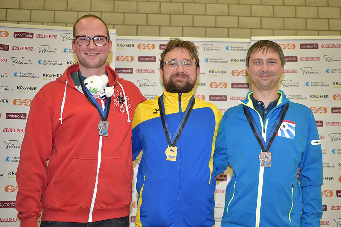 Der Senioren-Titelverteidiger aufgelegt, Alexander Buttazzo, sorgte gleich zu Beginn der Aargauer Meisterschaften für einen neuen Kantonalrekord. Er erzielte mit den 30 Schüssen ein Total von 314,0 Punkte, womit er den alten Rekordhalter Rolf Denzler übertraf. Dahinter sicherten sich Michele Tullo (306,4) und Stephan Bhend (305,2) die weiteren Medaillen in der Doppelkategorie Senioren/Veteranen. Trotz persönlich unbefriedigendem Total infolge tränenden Augen setzte sich auch der Titelverteidiger bei den Seniorveteranen, Andreas Christoffel, wieder durch. Das Siegerresultat lautet auf 307,5 Punkten. Dieses verfehlte Peter Schörg als Silbermedaillengewinner um einen lumpigen Zehntel. Nochmals einen Zehntelspunkte dahinter musste sich Roland Senn mit Bronze begnügen.