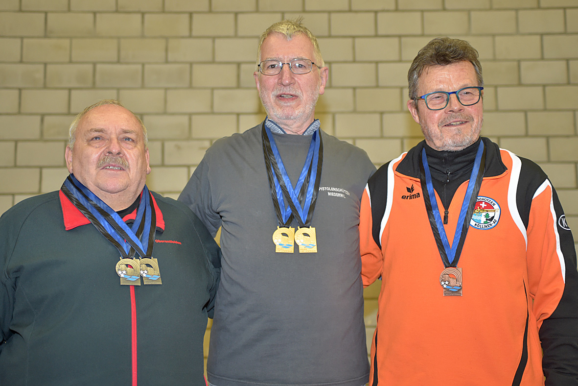 Bei den Veteranen mit der Pistole aufgelegt schnappte sich Michele Tullo (Fahrwangen) nach Silber mit dem Gewehr Gold mit der Pistole. Mit 285 Punkten übertrag er den Kölliker Alois Lacher um einen Zähler. 277 Ringe reichten Markus Thut (Baden) für Bronze. Bei den Seniorveteranen doppelte Andreas Christoffel, der mit der Pistole für Niederwil schiesst, nach. Er eroberte mit 288 Punkten innert einer Stunde einen zweiten Aargauer Meistertitel, wobei er diesmal Peter Schörg um drei Punkte distanzierte. Bronze ging mit 278 Punkten an Walter Tribelhorn (Kölliken). Nur drei Teilnehmer massen sich bei den Senioren mit der Pistole aufgelegt. Marcel Rohner (Brugg-Windisch) setzte sich gegen Leonardo Iapello (Kölliken) mit 283:275 Punkten durch.